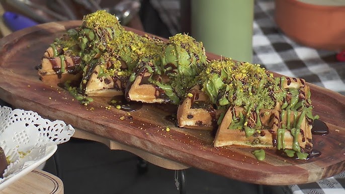 Layers of velvety peanut butter, silky pistachio cream and luscious milk chocolate crowned with golden kataifi crunch. we recommend either of the following to add flavour to your waffles: